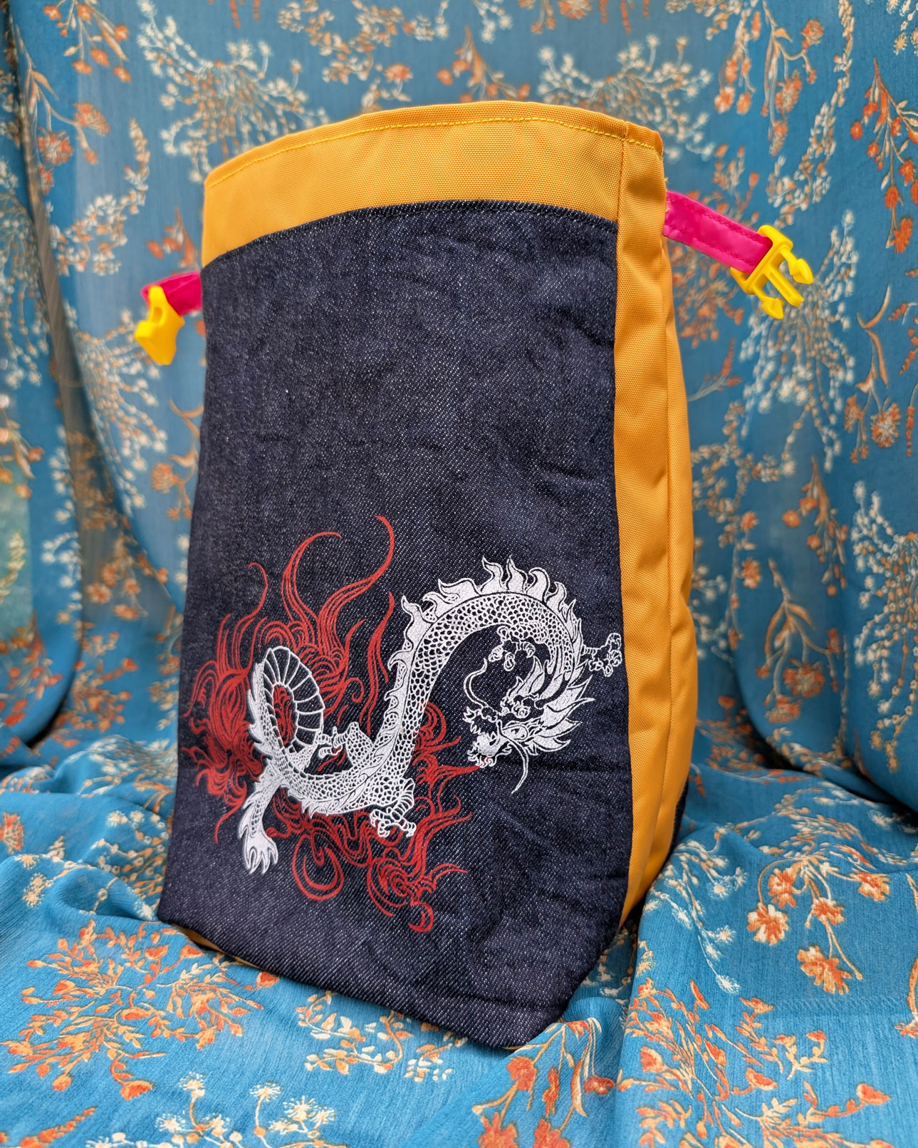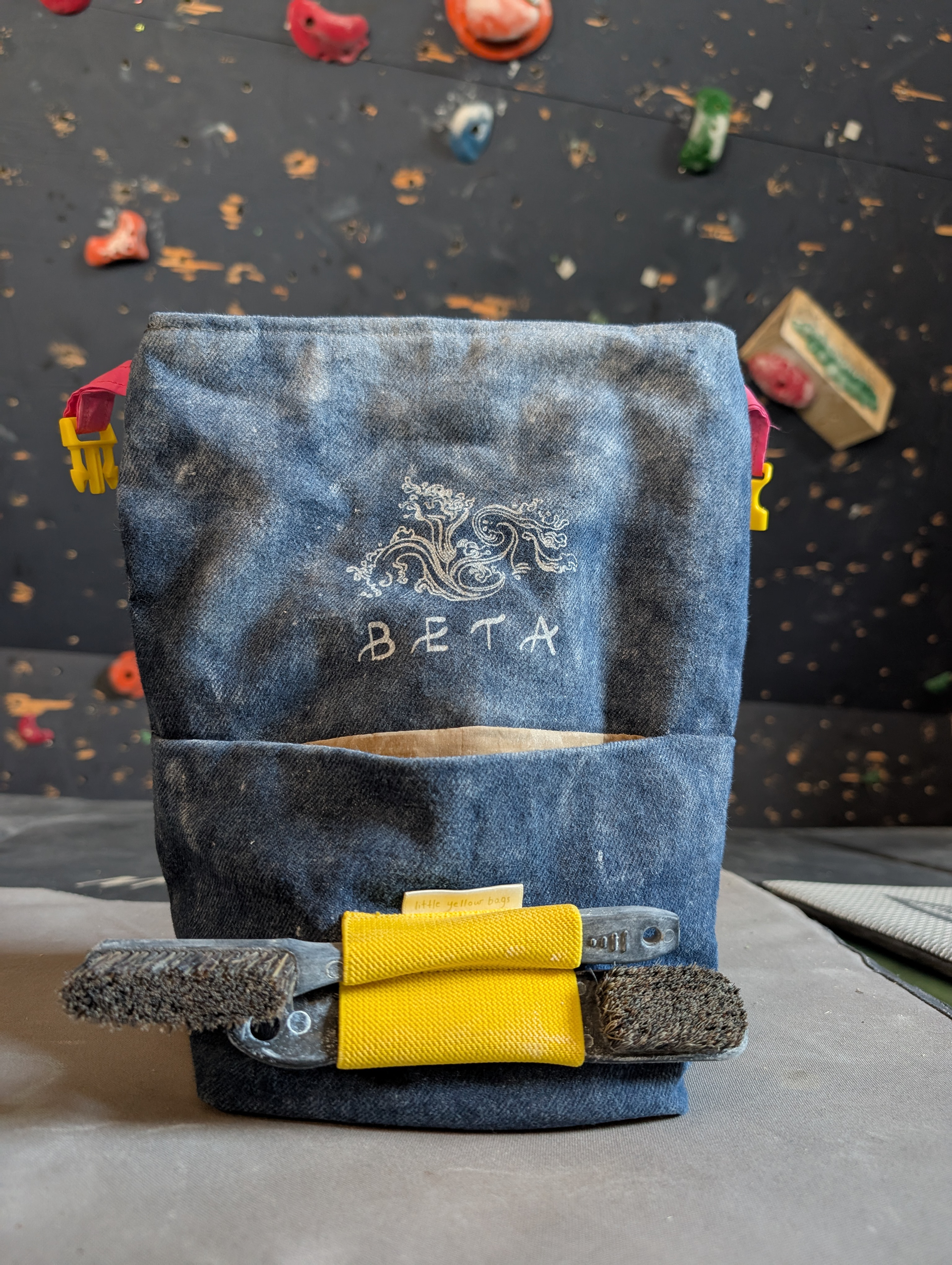These heavy-duty chalk bags are durable and large enough to put both hands in to chalk up for the next climb. Strong magnets close up the opening, so there is no need to wrestle with velcro or zippers. The front pouch fits a six-inch-tall smartphone horizontally, along with finger tape and other necessities. The front elastics hold two brushes perfectly, ensuring all your necessary gear is in one place. Denim is a unique fabric for chalk bags and will stand out in any gym.